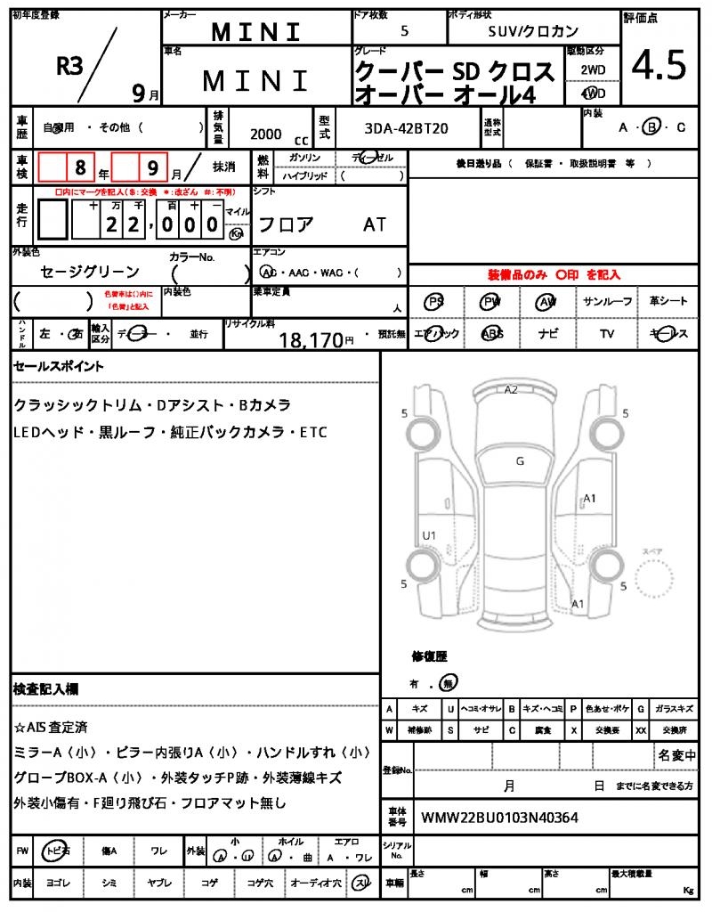 | VIN/Serial No. | WMW22BU0103N40364 |