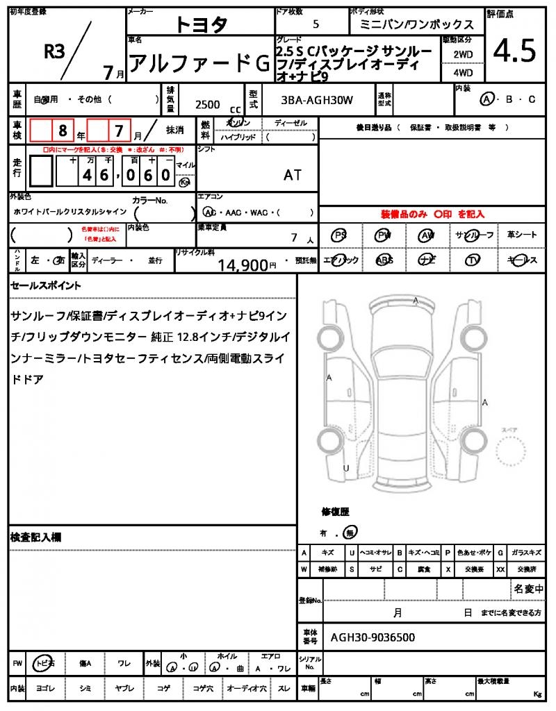 | VIN/Serial No. | AGH30-9036500 |