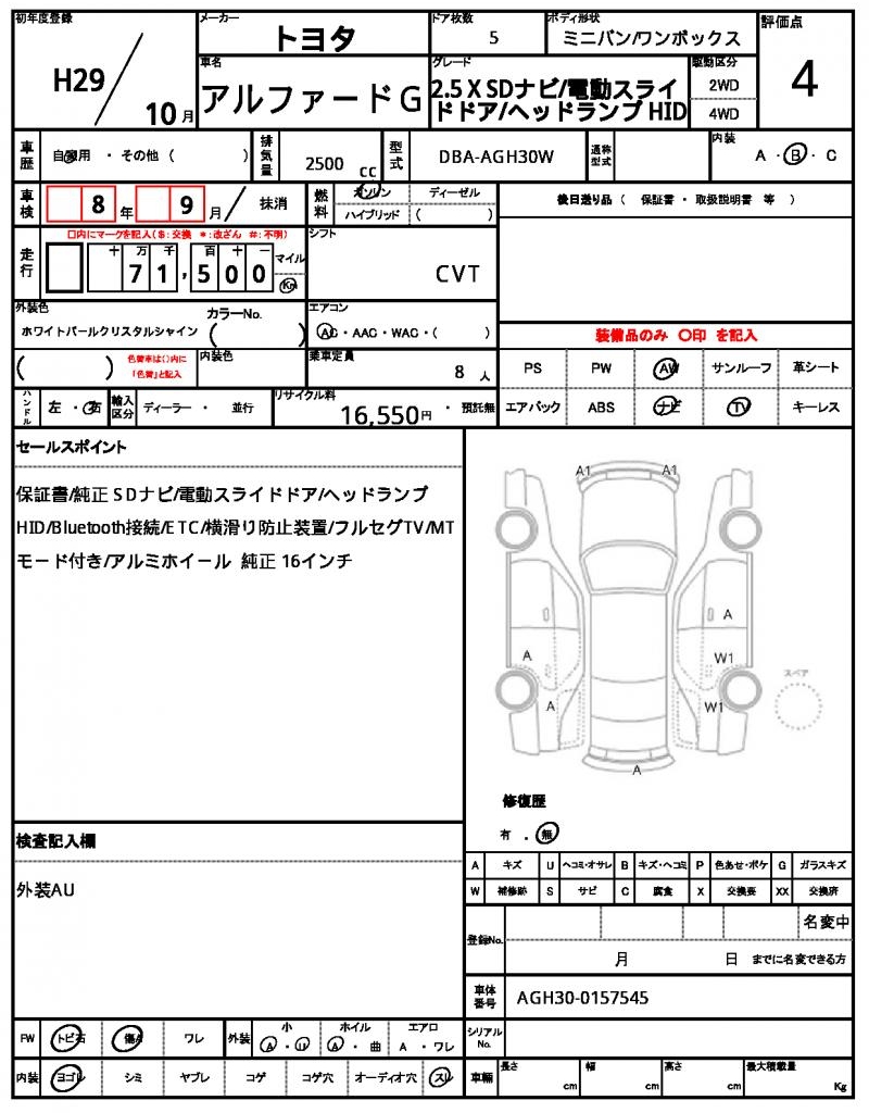 | VIN/Serial No. | AGH30-0157545 |