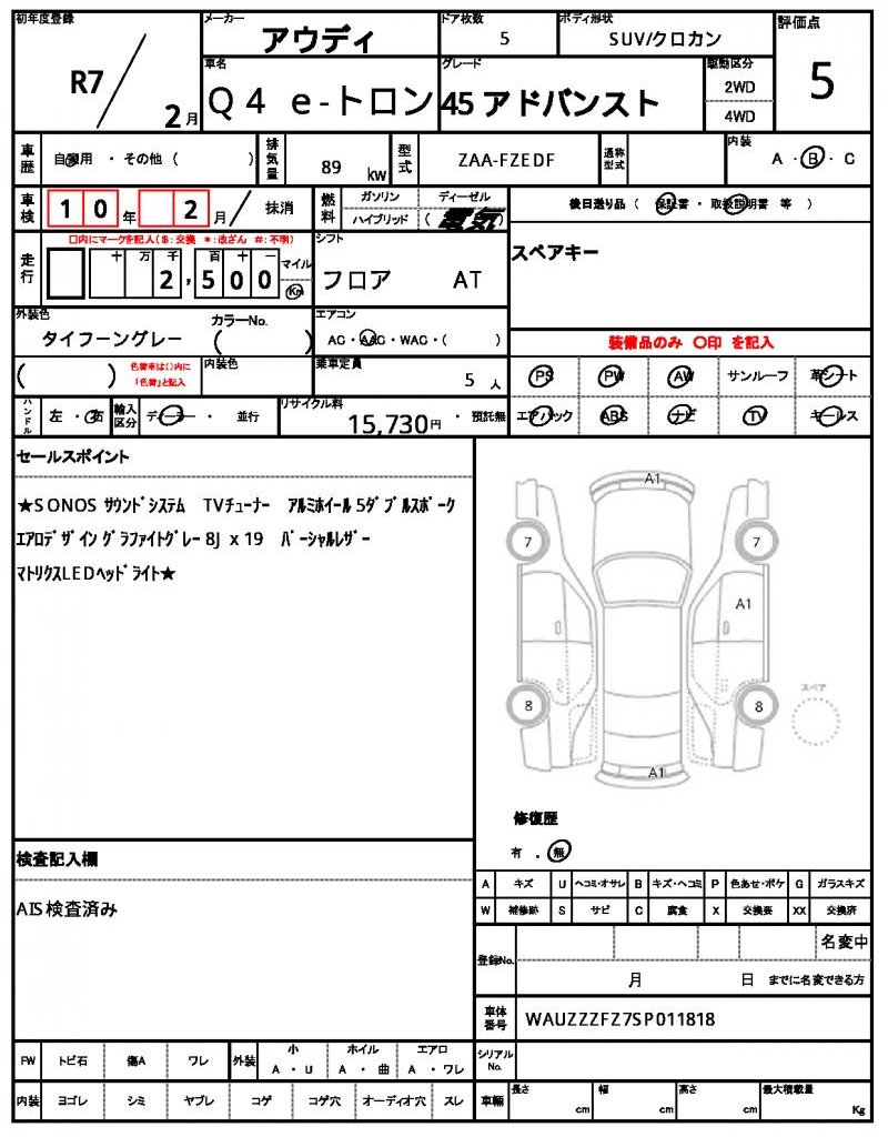 | VIN/Serial No. | WAUZZZFZ7SP011818 |