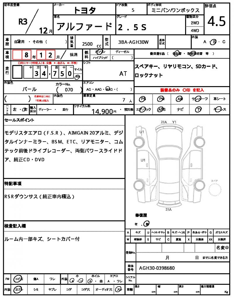 | VIN/Serial No. | AGH30-0398680 |