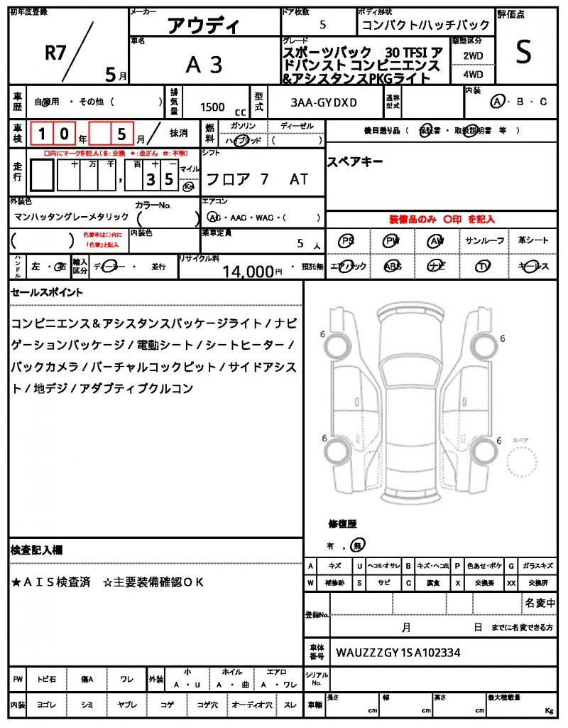 | VIN/Serial No. | WAUZZZGY1SA102334 |