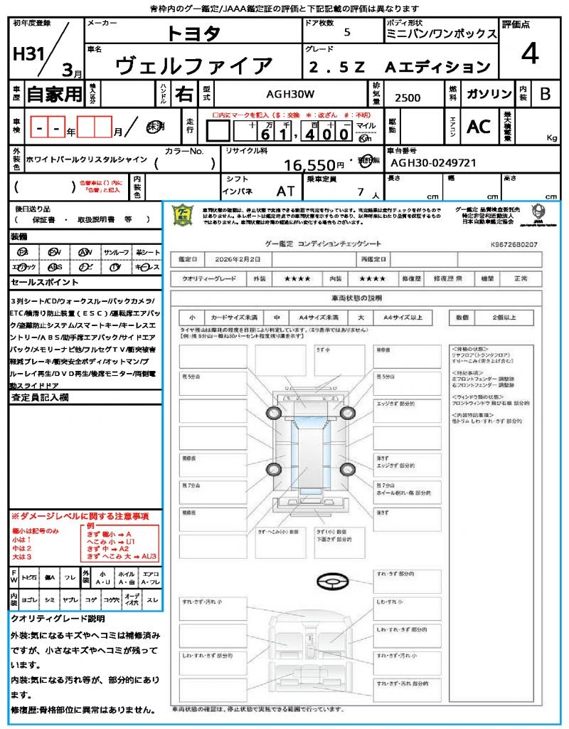 | VIN/Serial No. | AGH30-0249721 |