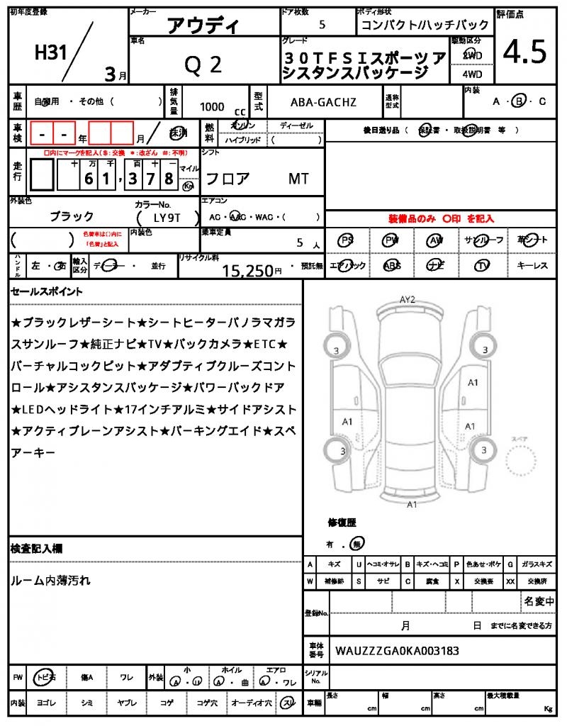 | VIN/Serial No. | WAUZZZGA0KA003183 |
