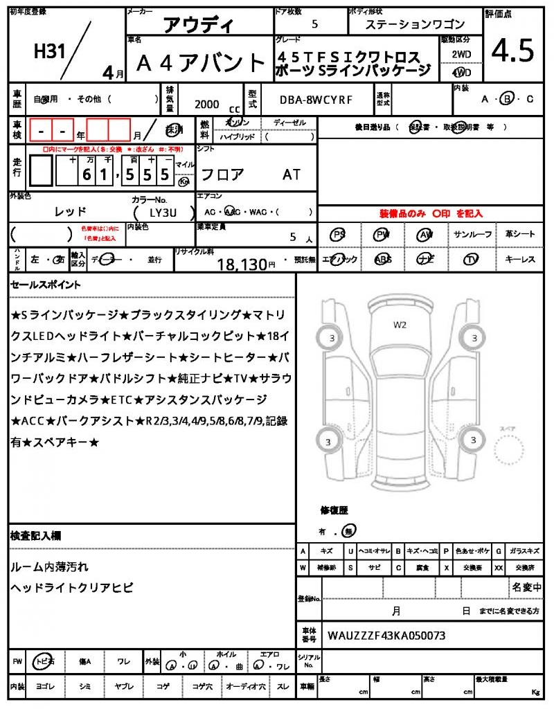 | VIN/Serial No. | WAUZZZF43KA050073 |