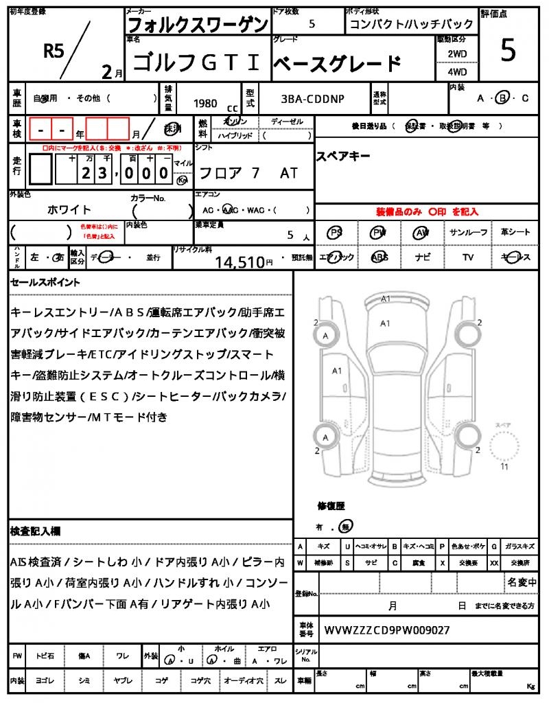 | VIN/Serial No. | WVWZZZCD9PW009027 |