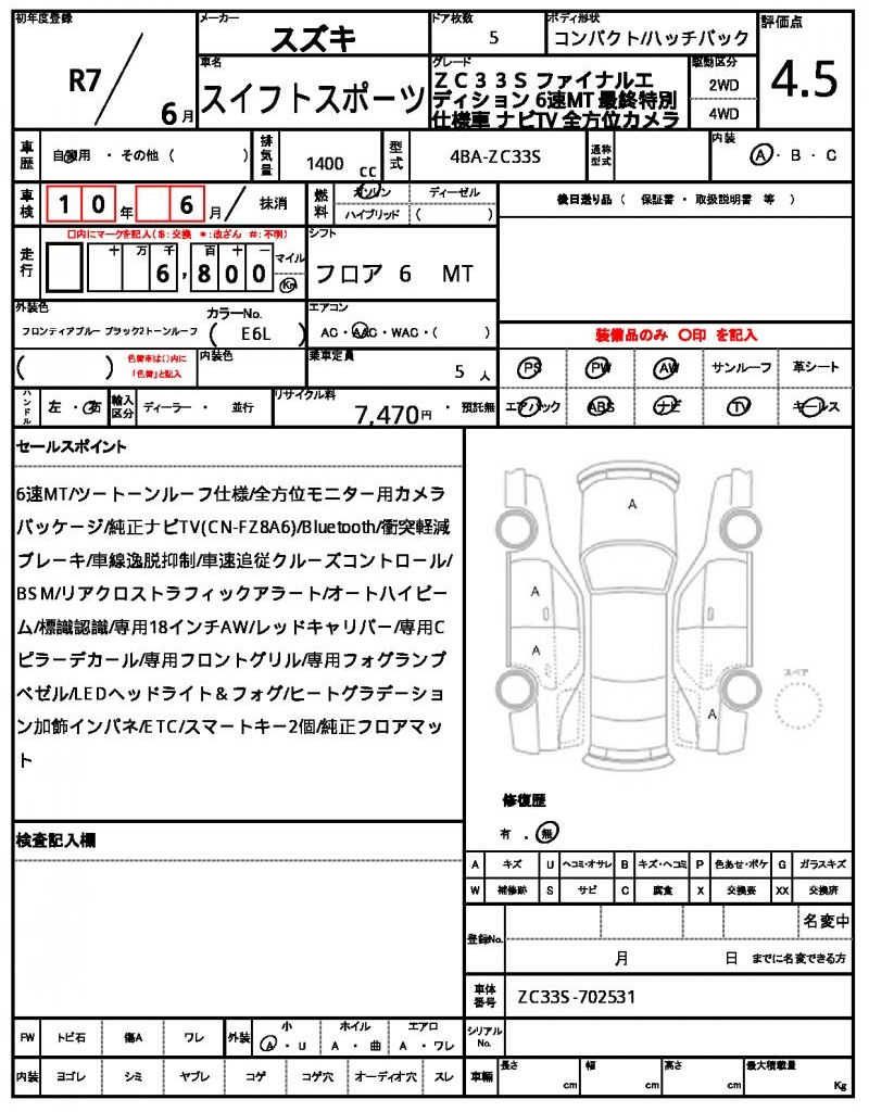 | VIN/Serial No. | ZC33S-702531 |