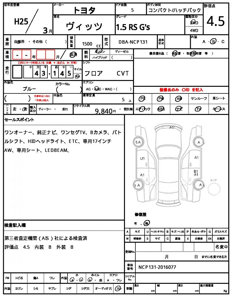| VIN/Serial No. | NCP131-2016077 |