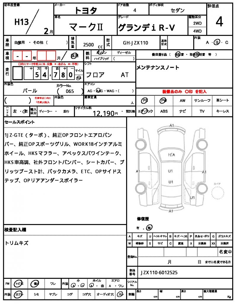 | VIN/Serial No. | JZX110-6012525 |